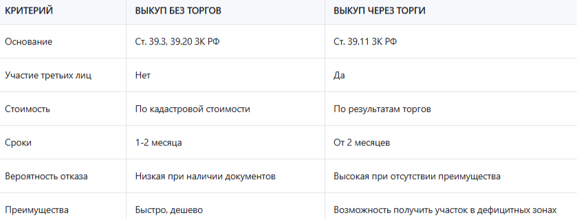 Таблица: сравнение выкупа земли с участием в торгах и без участия в торгах