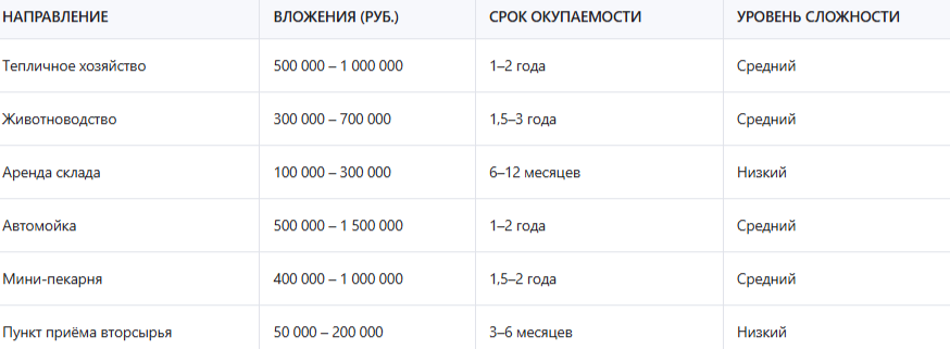 Доходность зависит от направления. Тепличный бизнес может давать 20–40% годовых, если правильно выбрать культуру и каналы сбыта. Аренда складских помещений — 8–12% годовых. Сельскохозяйственные проекты — 15–30%. Важно учитывать сезонность: некоторые виды бизнеса работают круглый год, другие — только весной и летом.