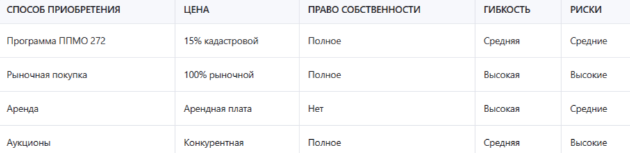 Аренда земли на длительный срок является альтернативой покупке, особенно для тех, кто не готов к крупным начальным вложениям. Однако аренда не даёт права собственности, и арендатор остаётся зависимым от условий договора и решений арендодателя. При этом аренда может быть более гибкой и требовать меньших начальных вложений. Однако для долгосрочных инвестиций и развития бизнеса право собственности, предоставляемое по программе ППМО 272, является более предпочтительным вариантом.
