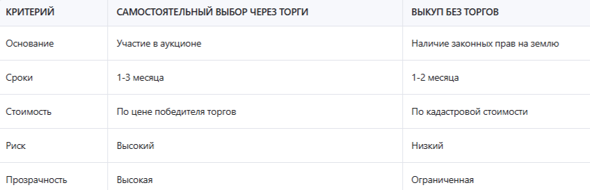 Сравнение самостоятельного выбора участка и выкупа без торгов