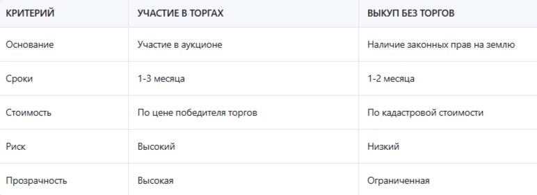 Как видно из таблицы, участие в торгах более рискованно, но позволяет получить земельный участок даже при отсутствии законных оснований для выкупа без торгов.