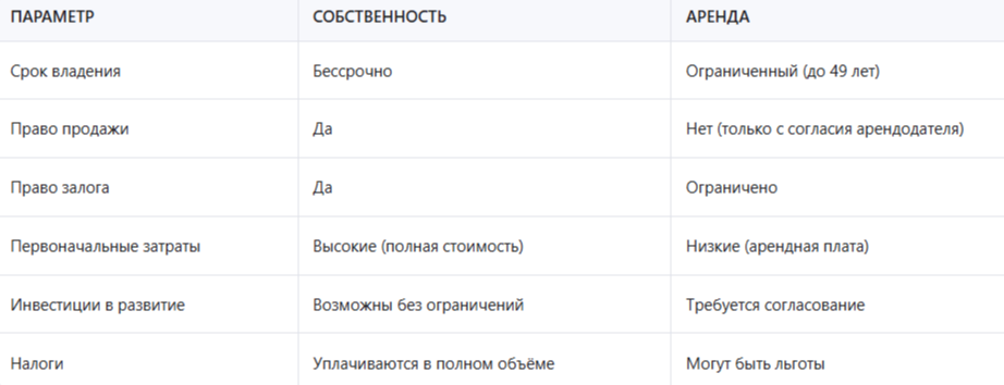 Получение земли в собственность предоставляет максимальную свободу в распоряжении участком. Однако это требует значительных первоначальных затрат и может быть нецелесообразно для краткосрочных проектов.