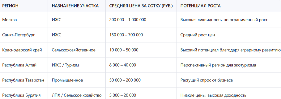 Эта таблица демонстрирует, что земля в разных регионах имеет разную цену и разный потенциал. Для инвестора важно не просто найти дешёвый участок, а правильно оценить, сможет ли он увеличиться в цене в будущем. Например, участок в Бурятии сегодня стоит недорого, но если регион начнет развивать сельское хозяйство или туристическую инфраструктуру, его стоимость может вырасти в разы.