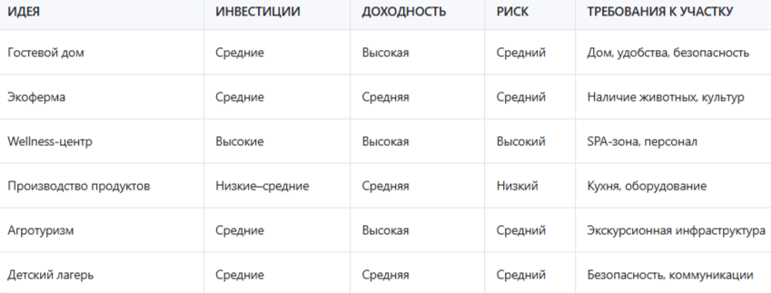 Каждая идея имеет свои особенности. Например, детский лагерь требует серьёзной подготовки и лицензирования, тогда как кофейня может быть запущена за пару недель. Главное — выбрать нишу, которая сочетается с вашими интересами, возможностями и расположением участка.