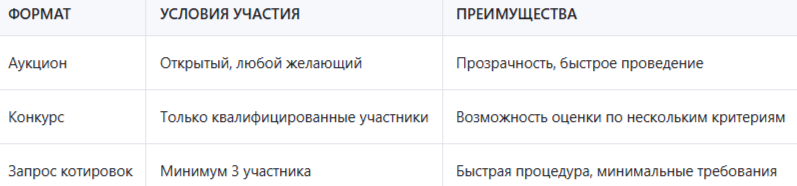 Сравнение форматов торгов: аукцион, конкурс, запрос котировок