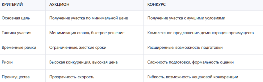 Таблица: сравнение стратегий участия в аукционе и конкурсе