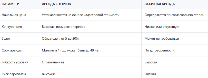 Аренда земли с торгов может быть выгоднее, если вы хотите получить участок на длительный срок и готовы конкурировать. Однако для краткосрочных проектов или ограниченного бюджета обычная аренда может оказаться более подходящей.