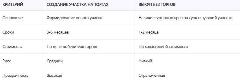Сравнение создания участка на торгах и выкупа без торгов