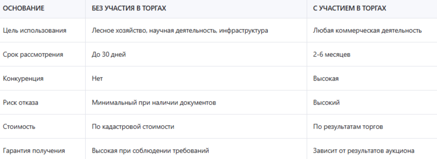 Сравнение оснований для получения земли в лесу с участием и без участия в торгах