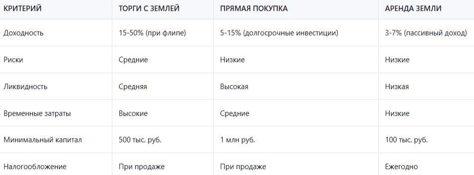 Как видно из таблицы, торги с землей предлагают высокую доходность при средних рисках. Однако они требуют больше времени и знаний для успешной реализации стратегии.