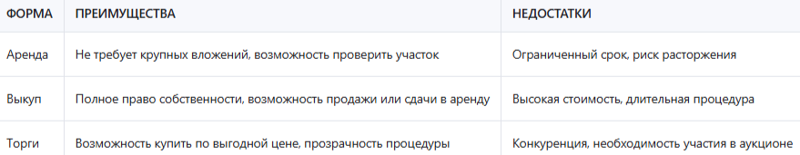Эта таблица поможет понять, какой вариант подходит вам больше. Если вы хотите купить землю, которая была в аренде, торги — это один из самых доступных и прозрачных способов.
