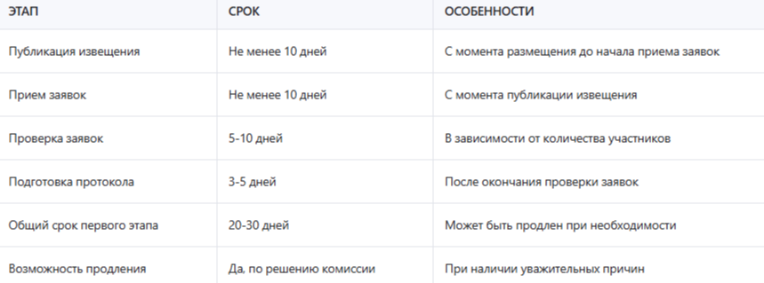 Продолжительность приема заявок на первом этапе торга определяется в извещении о проведении торгов и составляет не менее 10 дней с момента публикации извещения. Организатор торгов вправе установить более длительный срок приема заявок, но не менее установленного минимального срока.