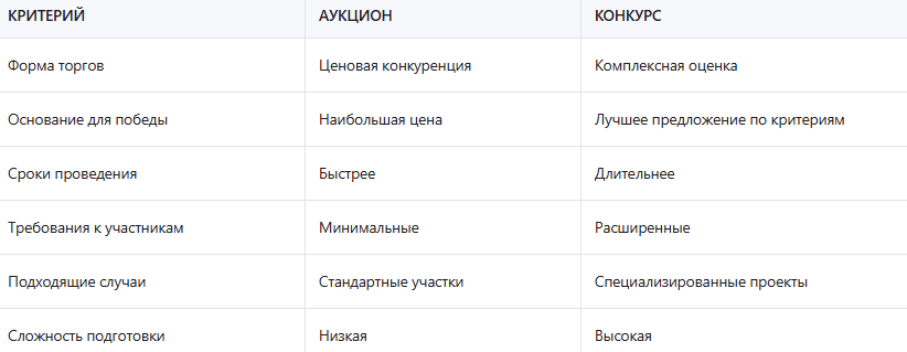 Таблица: сравнение аукциона и конкурса при покупке земли у администрации