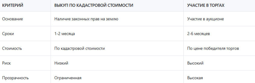 Как видно из таблицы, выкуп по кадастровой стоимости более предсказуем и экономически выгоден, однако требует наличия законных оснований и точного соблюдения процедуры.