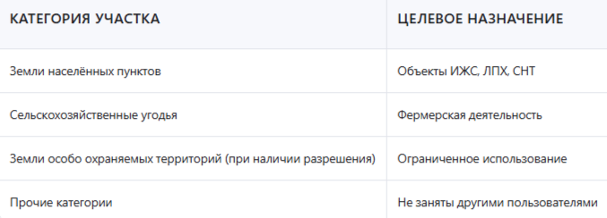В зависимости от целей использования, подходят разные категории земель. Вот основные варианты: