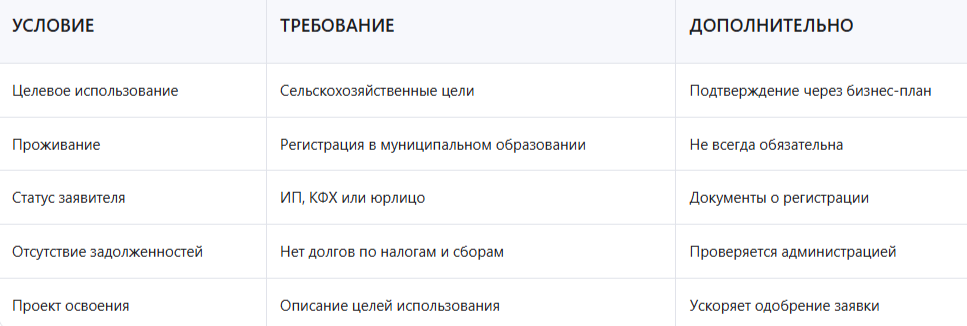 Чтобы получить сельскохозяйственный участок без аукциона, необходимо соответствовать следующим требованиям: