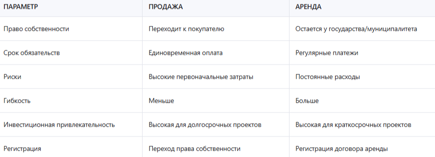 При продаже земельного участка происходит переход права собственности к покупателю, требуется единовременная оплата стоимости участка. При аренде право собственности остается у государства, требуется заключение договора аренды с регулярными платежами. Выбор зависит от целей и финансовых возможностей участника.
