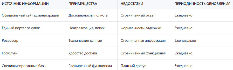 - Анализ официальных источников информации - изучение сайтов органов местного самоуправления, Единого портала закупок и иных официальных ресурсов