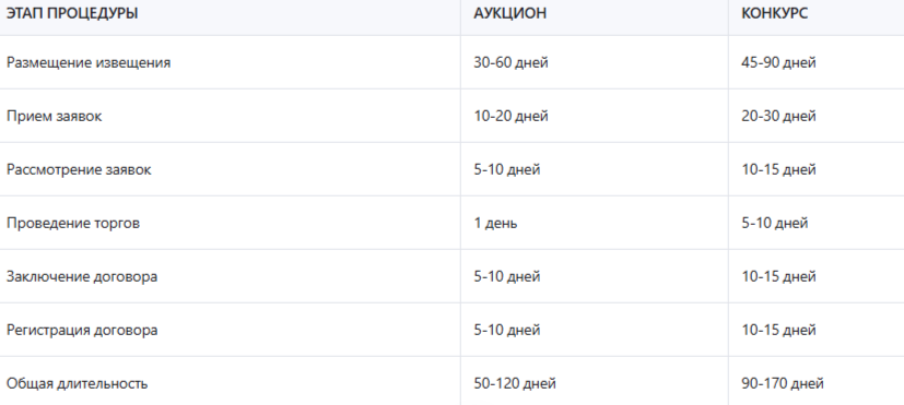 Таблица: сравнение сроков проведения аукциона и конкурса