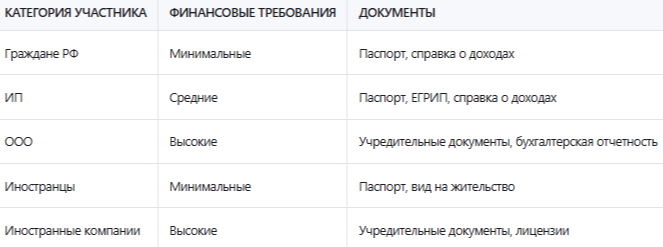 Сравнение условий участия для различных категорий участников