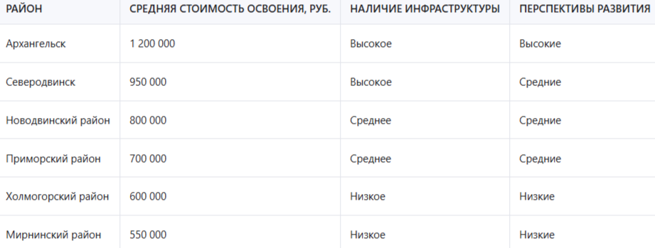 Приморский и Холмогорский районы предлагают более доступные варианты участков с меньшими затратами на освоение. Однако уровень инфраструктуры в этих районах ниже, что может потребовать дополнительных вложений в будущем. Эти районы имеют перспективы развития благодаря строительству новых транспортных магистралей и развитию промышленности. Новодвинский район занимает промежуточное положение по всем параметрам, предлагая умеренные условия и перспективы развития.