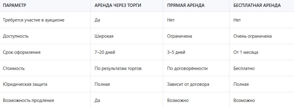 Эта таблица позволяет быстро сравнить основные параметры разных способов аренды. Она особенно полезна для тех, кто выбирает между прямыми переговорами и участием в торгах.