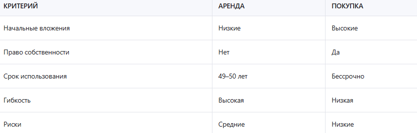 При выборе между арендой и покупкой земли важно учитывать цели и ресурсы. Покупка даёт полное право собственности, но требует крупных начальных вложений. Аренда же позволяет начать с меньшими затратами и получить землю на длительный срок. В некоторых случаях аренда выгоднее, особенно если участок находится в государственной собственности и не может быть продан.