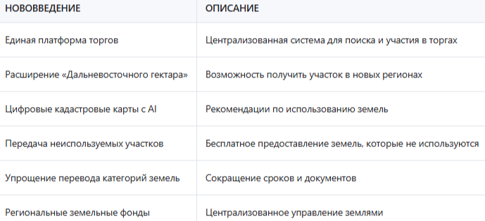 Программа форума «Земли России 2025» значительно расширена по сравнению с предыдущими годами. В этом году акцент сделан на практической реализации новых механизмов доступа к земле, поддержке инвестиций и цифровизации процессов. Ниже приведены ключевые нововведения, которые будут представлены на мероприятии.