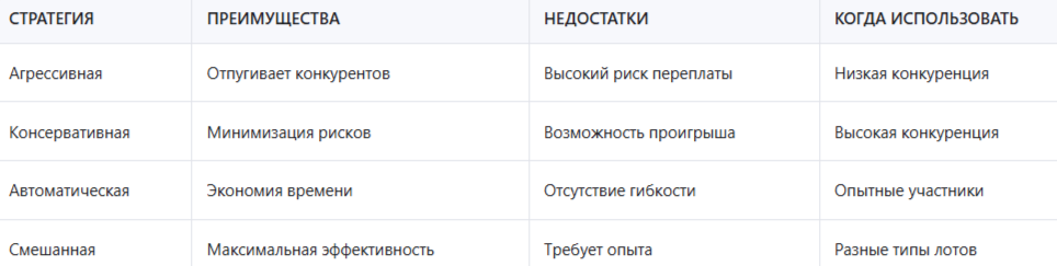 Выбор стратегии зависит от типа лота и уровня конкуренции. Для новичков подходит консервативная стратегия, для опытных участников — смешанная с элементами автоматизации.