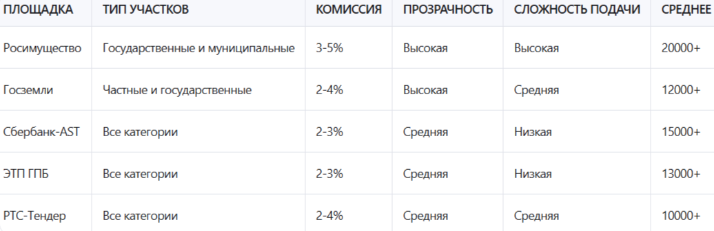 Существует несколько типов торговых площадок, на которых проводятся торги земельных участков. Каждая из них имеет свои особенности, преимущества и недостатки. Ниже представлена таблица сравнения основных площадок: