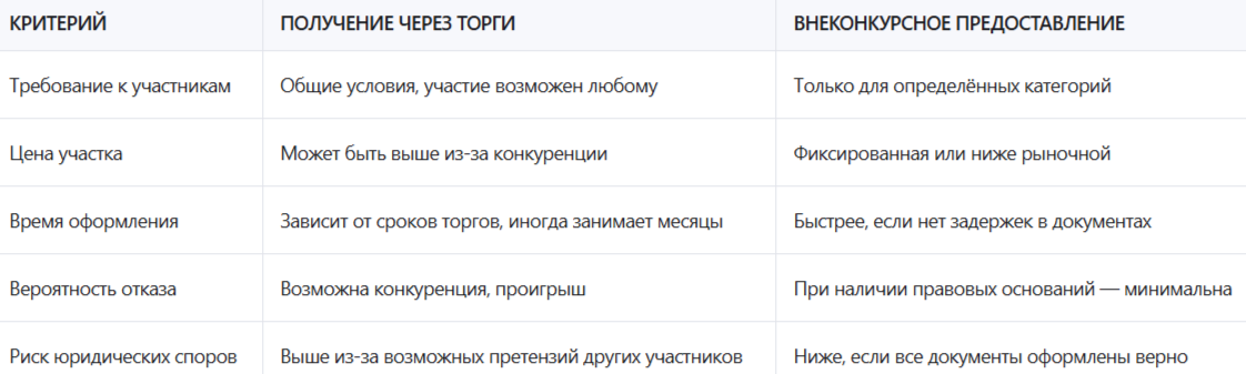 Как видно из таблицы, внеконкурсное предоставление земельного участка имеет ряд преимуществ: снижает стоимость, ускоряет процесс и уменьшает юридические риски. Однако оно доступно только ограниченной группе граждан и организаций, что делает этот путь менее универсальным, чем участие в торгах.