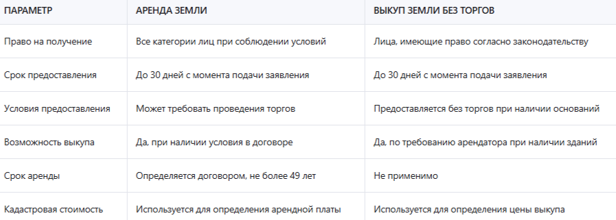 Таблица: сравнение условий аренды и выкупа земли у администрации