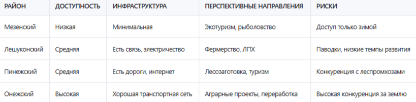 Таблица: Сравнение реальных возможностей освоения в разных районах Архангельской области