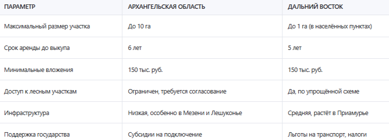 Таблица: Сравнение условий получения арктического гектара в Архангельской области и на Дальнем Востоке