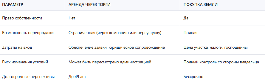 - Аренда на 49 лет — наиболее привлекательный вариант для инвестиций. Такие договоры заключаются через торги и предоставляют стабильность, необходимую для реализации долгосрочных проектов.