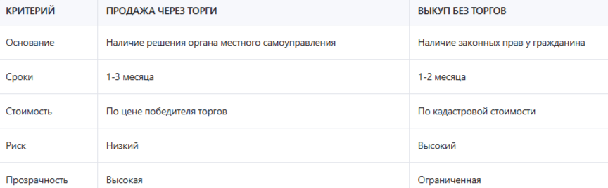 Сравнение продажи участка через торги и выкупа без торгов