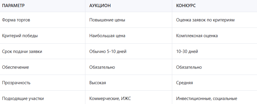 Таблица: Сравнение аукциона и конкурса при продаже земли