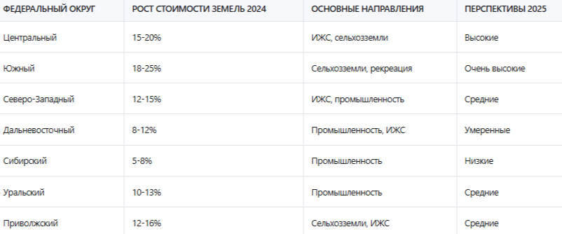 Региональные различия в развитии земельного рынка в 2025 году сохранятся, но могут измениться в сторону усиления конкуренции за наиболее привлекательные территории. Центральный и Южный федеральные округа продолжат демонстрировать наиболее высокие темпы роста, связанные с близостью к крупным городам и развитой экономической инфраструктурой. Сибирский и Дальневосточный федеральные округа могут показать ускорение развития за счет реализации крупных инфраструктурных проектов и государственных инвестиций. По оценкам специалистов, в 2025 году разрыв в стоимости земель между регионами может увеличиться из-за концентрации инвестиций в наиболее перспективные территории.