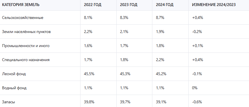 Структура земельного фонда России претерпевает значительные изменения, связанные с изменением экономических условий и государственной политикой в сфере землепользования. По данным Росстата, в 2024 году произошло увеличение доли земель сельскохозяйственного назначения с 8,3% до 8,7% от общей площади земельного фонда страны. Это связано с реализацией национальных проектов в сфере сельского хозяйства и увеличением площадей, изымаемых из других категорий земель для сельскохозяйственного использования. В то же время доля земель населённых пунктов снизилась с 2,1% до 1,9%, что связано с оптимизацией использования городских территорий и развитием вертикальной застройки.