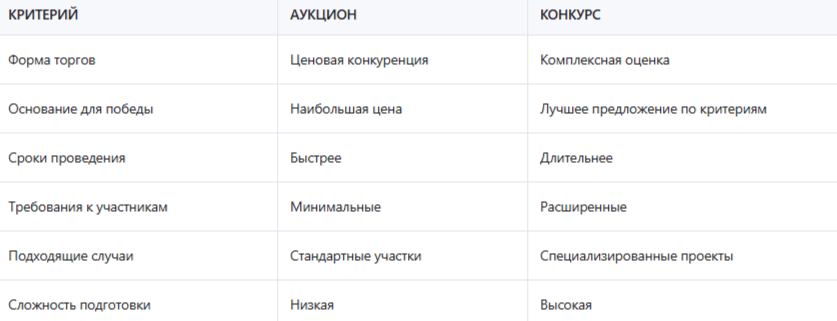 Таблица: сравнение аукциона и конкурса при приобретении земли