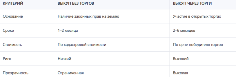 Как видно из таблицы, выкуп без торгов более предсказуем и экономически выгоден, однако требует наличия законных оснований и точного соблюдения процедуры.