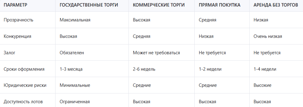 Прямая покупка наиболее проста и быстра, но не всегда доступна для привлекательных участков. Аренда без торгов может быть удобной, но часто связана с высокими юридическими рисками. Выбор способа зависит от целей, возможностей и уровня опыта участника.