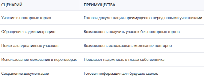 Кроме того, если вы участвовали в аукционе как частное лицо или юридическое лицо, но не выиграли, межевание может быть полезным и для других участков. Например, если рядом есть похожие лоты, которые могут быть выставлены на торги, ваша подготовленная документация может стать преимуществом при участии в новых аукционах.
