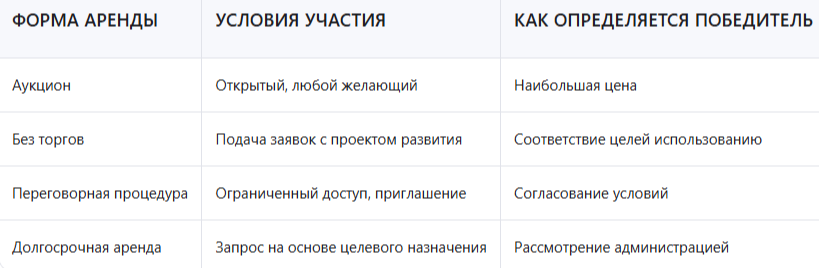 - Аренда на условиях торгов — самый распространённый вариант. Победителем становится участник, предложивший наибольшую цену.