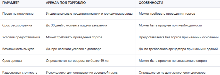 Таблица: сравнение условий получения аренды земли под торговлю