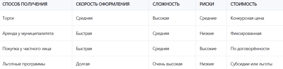 Эта таблица поможет понять, какой способ получения земли больше соответствует вашим финансовым возможностям и целям. Например, если вы хотите быстро начать бизнес, лучше рассмотреть аренду у муниципалитета. Если же готовы к длительной процедуре ради снижения затрат — льготные программы станут отличным выбором.