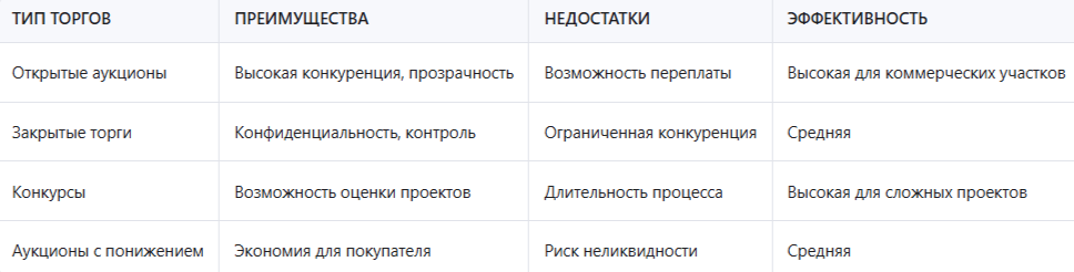 Конкурсы наиболее эффективны для сложных инвестиционных проектов, где важна не только цена, но и качество предлагаемых решений. Аукционы с понижением подходят для земель с низкой ликвидностью, где основная цель - найти покупателя по минимальной цене.