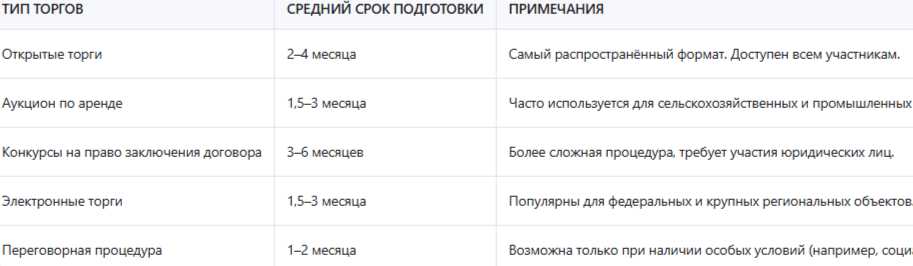 Из таблицы видно, что наиболее быстрые торги — переговорные и электронные, но они имеют ограниченный доступ и специфические условия. Если вы хотите участвовать в таких торгах, важно заранее получить консультацию у юристов или специализированных компаний.
