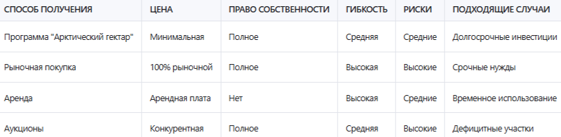 При выборе способа получения земельного участка в Арктике важно сравнить программу "Арктический гектар" с другими доступными вариантами. Традиционная покупка земли на открытом рынке требует значительных финансовых вложений и может быть связана с высокими рисками. Цена на рынке обычно соответствует рыночной стоимости, которая может быть в 3-10 раз выше, чем стоимость участка по программе "Арктический гектар". Однако при покупке на рынке покупатель получает участок без ограничений и обязательств по дальнейшему использованию. Это делает традиционную покупку более предпочтительной для тех, кто хочет получить участок без дополнительных обязательств.