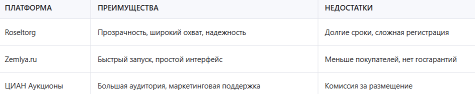 Государственные площадки, такие как Roseltorg , ЕЭТП , ООС Закупки , используются для реализации земель, находящихся в муниципальной или государственной собственности. Они отличаются высокой степенью прозрачности, автоматизированной процедурой регистрации заявок и возможностью участия со всей страны. Однако сроки организации торгов здесь могут быть довольно длительными — до 45 дней.